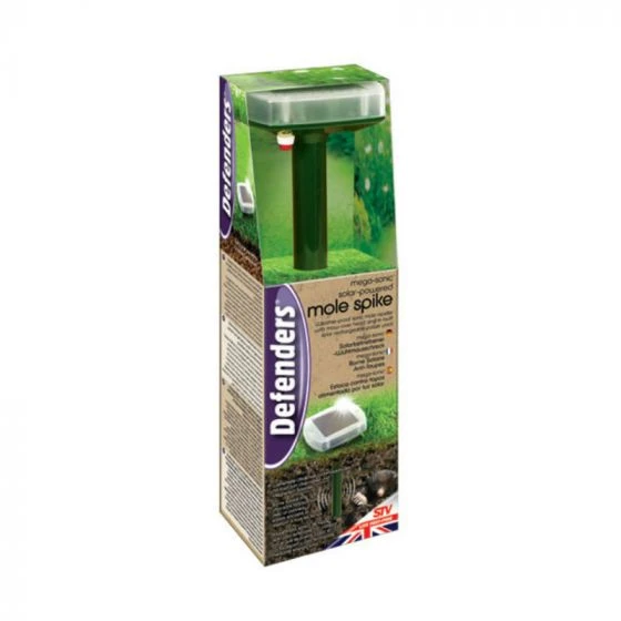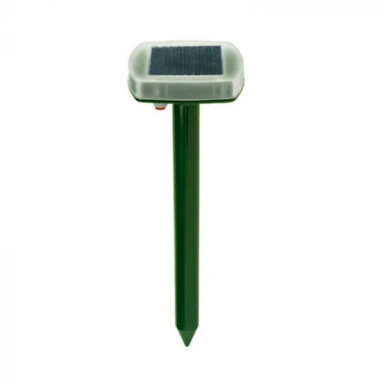 Weather-proof sonic mole repeller with mow-over head and built in solar rechargeable power pack. Drives off moles without harm to protect your lawns seed beds and seedling plants.