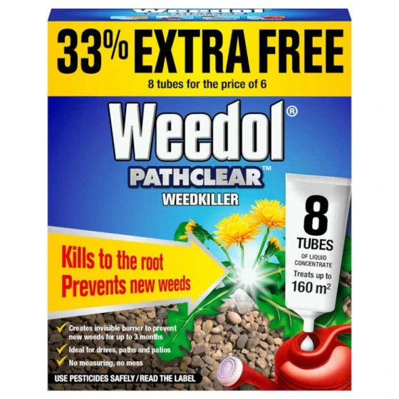 Weedol Pathclear creates invisible barrier that prevents new weeds for up to 3 months. Ideal for paths, drives, and patios. No measuring, no mess. Just squeeze liquid into a watering can.