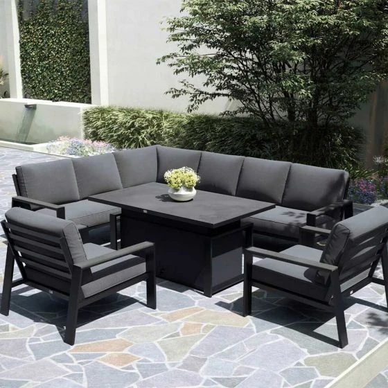 This modern Livorno Corner Modular Set with height adjustable table in chic shades of grey features thick cushions for extra comfort, ensuring optimal levels of relaxation and enjoyment are achieved.