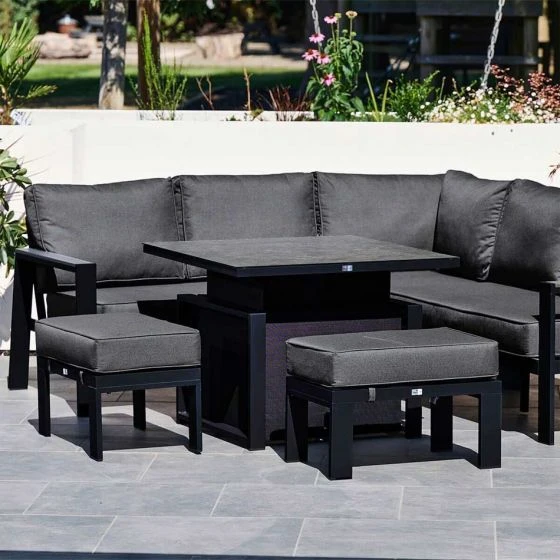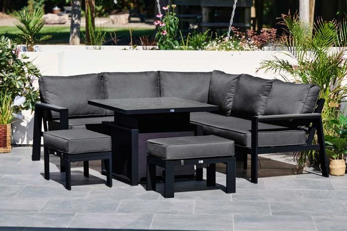 The supportive back bars gives the Livorno chair a powerful characteristic and with the large plump back cushions, the comfort is unforgettable. The thick Polywood armrests fit in nicely with the powder-coated frames creating an extra depth to the Livorno’s overall style. This luxury range consists of a compact corner sofa with two seats either side of the corner unit, two additional footstools and an adjustable pump action table. The summer-proof cushions in the Livorno range provide optimal comfort. All cushion covers are zipped for easy cleaning and the fabric is designed to resist damp and to assist drying.